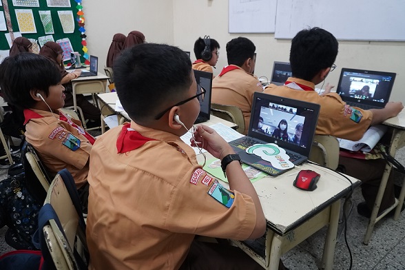 Siswa kelas 6 SD Al Hikmah Surabaya mengikuti kegiatan Collaboration Class bersama sekolah asal Jepang melalui aplikasi Zoom. Kegiatan ini merupakan kegiatan pembelajaran bahasa Inggris bersama antara SD Al Hikmah dengan sekolah-sekolah di Jepang yang dilakukan secara daring zoom.
