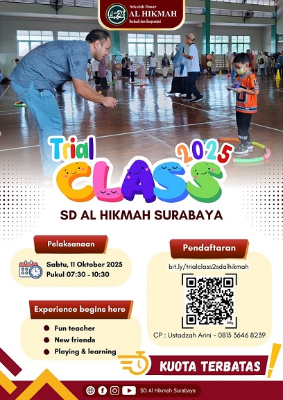 Surabaya, 02 Oktober 2025 – SD Al Hikmah kembali menyelenggarakan Trial Class sebagai bagian dari rangkaian kegiatan pengenalan sekolah bagi calon peserta didik baru. Kegiatan ini akan memasuki gelaran ketiga pada Sabtu, 11 Oktober 2025.